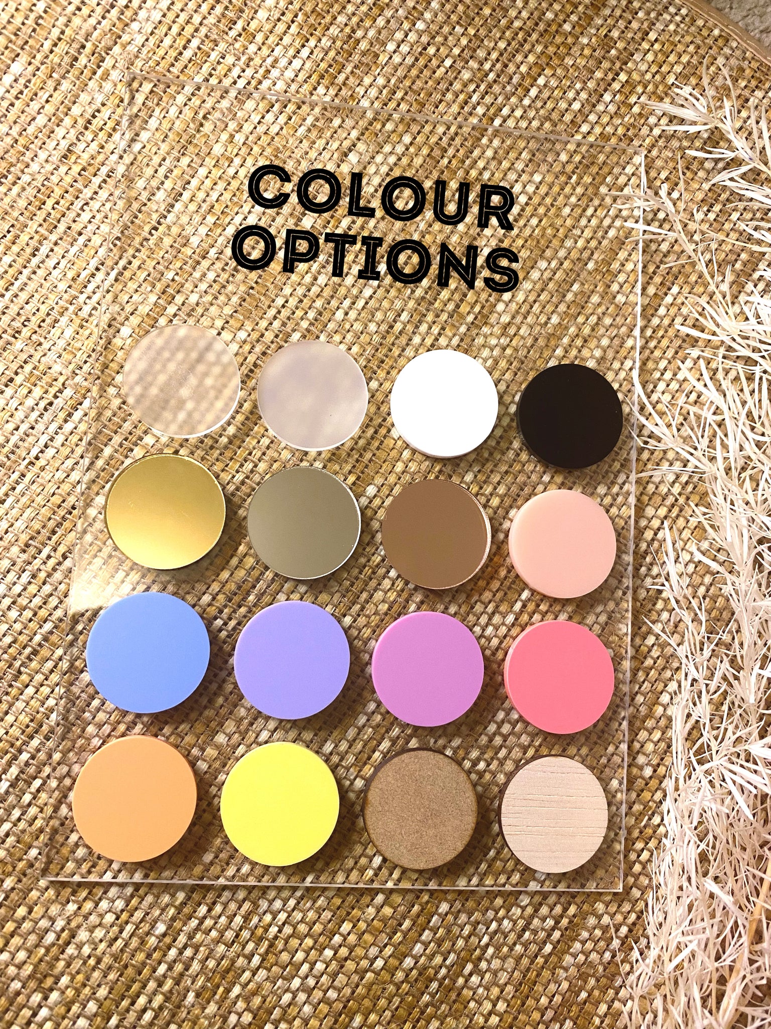 Two layers acrylic available in many acrylic colours including; clear, black, white, blush, mirror gold, mirror rose gold or mirror silver.