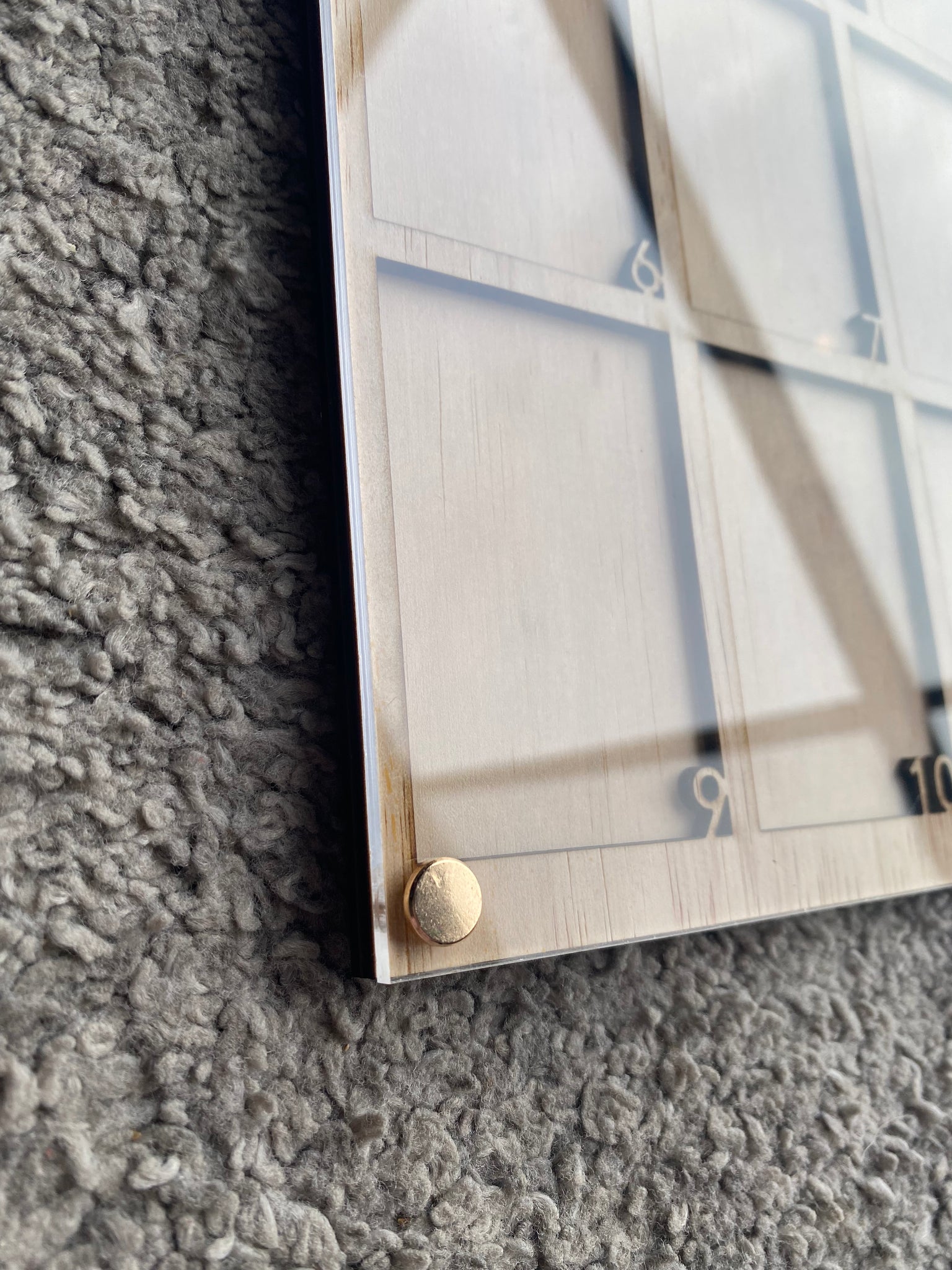 Watch them grow! A beautiful display and keepsake for your treasured school photos. Gold chicago screws hold two layers of ply and one acrylic layer together so you can open and add photos as they grow. There are 12 smaller openings for wallet size photos that measure 5x7.5cm and 2 large openings measuring 12x15.5cm.