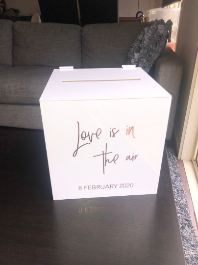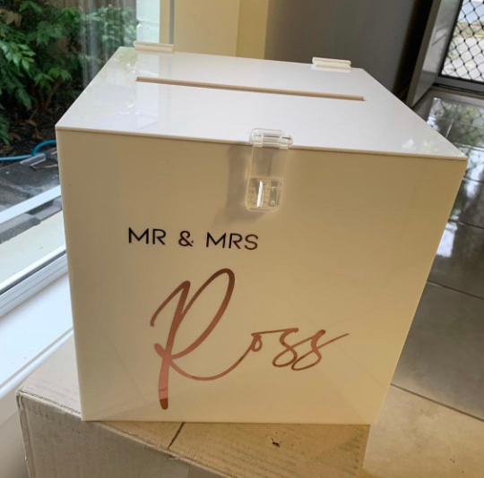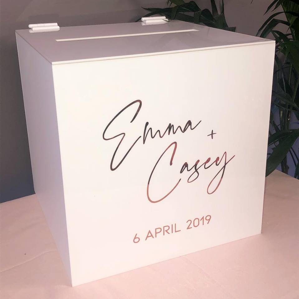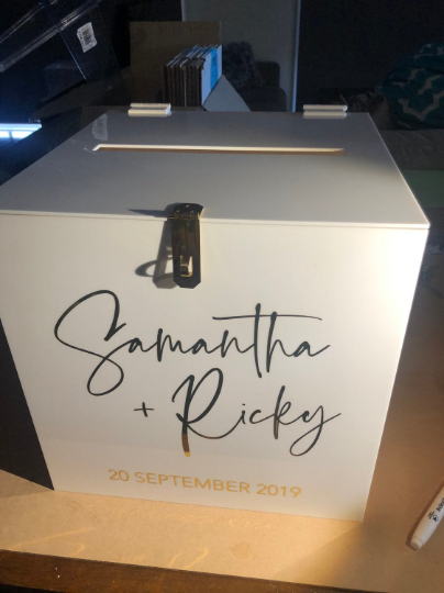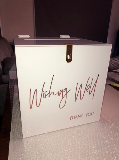 Large 30cm white acrylic wishing well/ card box with card slot opening.